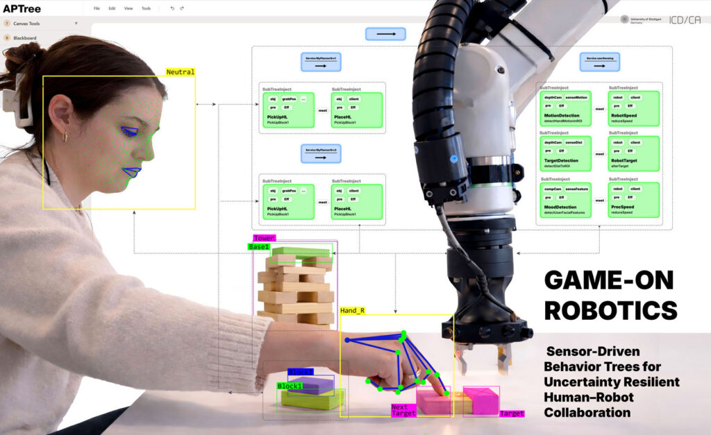 APTree framework make this dynamic integration possible. It utilizes behavior trees, which are commonly used to dynamically design video game entity behaviors, and integrates ATP methods and sensor data in an accessible method for architects. Real-time sensing continuously informs the automated task planners, enabling contextaware adjustments and strengthening stability and safety in collaborative assembly tasks. Crucially, APTree provides a domain-specific language and interface that allows designers and architects to specify tasks and goals without technical expertise in planning algorithms or robotic control.